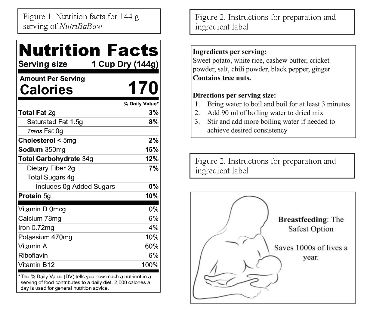 NutriBaBaw is a nutritious product specifically formulated for new and expectant mothers in Cambodia. This instant rice porridge provides essential macronutrients such as vitamin B12, vitamin A, and is high in protein. NutriBaBaw is comprised entirely of local ingredients, and using cricket powder as a sustainable source of protein. During this product development process, our team of five conducted literature review, ideation, developed product formulation and ingredient functionality, executed sensory evaluation plan and shelf-life estimation, created process flow diagram, performed safety evaluation and hazard analysis, examined economic feasibility, and devised a marketing plan with package design.